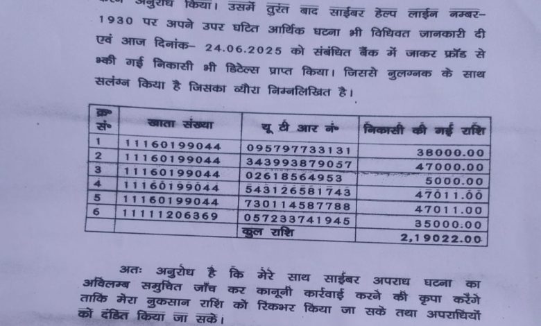 निकासी निम्नलिखित यूटीआर नंबरों पर हुई– 095797733131, 343993879057, 02618564953, 543126581743, 730114587788, और 057233741945. पीड़ित ने तुरंत 1930 साइबर हेल्पलाइन पर कॉल कर जानकारी दी और बैंक से संपर्क कर खाता भी ब्लॉक करवाया। 24 जून को पीड़ित ने संबंधित बैंक से पूरी ट्रांजैक्शन डिटेल प्राप्त कर साइबर थाना को सौंप दिया है. उन्होंने मांग की है कि उनकी राशि की रिकवरी कर अपराधियों पर कठोर कार्रवाई की जाए।