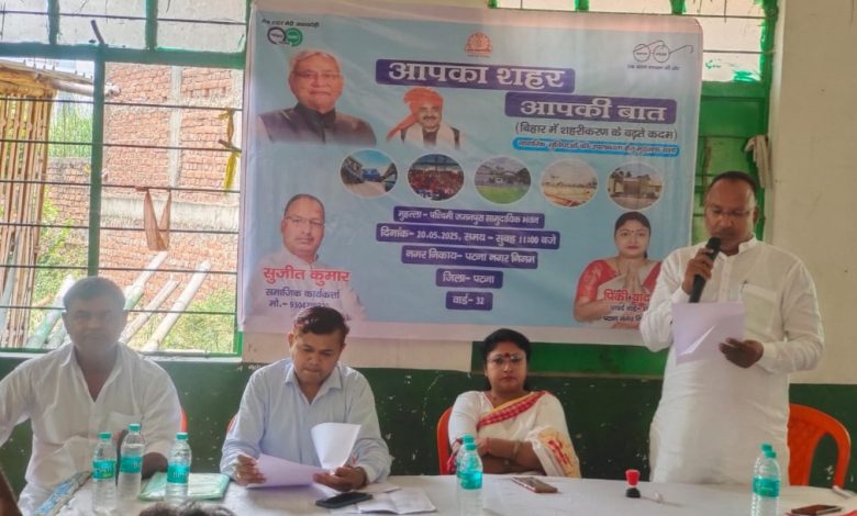 फुलवारी शरीफ । नगर विकास एवं आवास विभाग, बिहार, पटना के द्वारा “आपका शहर आपकी बात” कार्यक्रम के तहत “नगर जनसंवाद” का आयोजन वार्ड संख्या-32, पटना नगर निगम अंतर्गत पश्चिमी जगनपुरा के सामुदायिक भवन में किया गया.इस कार्यक्रम में स्थानीय वार्ड पार्षद पिंकी यादव, सहायक लोक स्वच्छता एवं अपशिष्ट प्रबंधन पदाधिकारी शुभम कुमार, जिला भू-अर्जन पदाधिकारी श्री रंजन कुमार चौधरी एवं स्थानीय नागरिकगण शामिल हुए.