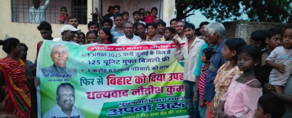 फुलवारी शरीफ. मुख्यमंत्री नीतीश कुमार द्वारा राज्य के सभी घरेलू उपभोक्ताओं को हर माह 125 यूनिट मुफ्त बिजली दिए जाने की घोषणा के बाद फुलवारी शरीफ के बेऊर-हसनपुरा महादलित टोले में गुरुवार को उत्सव जैसा माहौल देखने को मिला. इस फैसले से प्रभावित स्थानीय लोगों ने मिठाइयाँ बाँटकर खुशी जताई और सरकार के प्रति आभार प्रकट किया।
