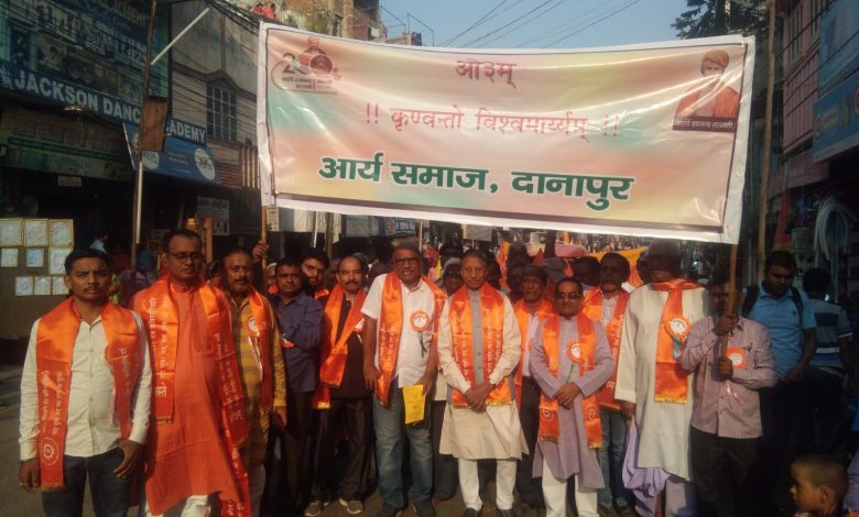 दानापुर वेद की ज्योति जलती रहे “ओम का झंडा ऊंचा रहे” के उद्घोष के साथ मंगलवार को डीएवी इंटर स्कूल से आर्य समाज  का 145वां वार्षिकोत्सव का आगाज किया। मंगलवार को डीएवी इंटर स्कूल से गाजे-बाजे के साथ आर्य समाज का शोभा यात्रा निकाला गया. जो नगर के मुख्य मार्ग मछुआ टोेली, थानापर, बीबीगंज, बस पडाव, सदर बाजार , इमलीतल, गोलापर , तकियापर , बेलतल व  गोलापर होते हुए स्कूल में समाप्त हो गया. शोभा यात्रा में पूर्व राज्यपाल गंगा प्रसाद, आर्य समाज के प्रधान संजय कुमार सिंह,  राम बिशुन सिंह, सत्यदेव गुप्ता, सुरेंद्र कुमार सिन्हा, पारस नाथ मेहता, बलदेव मेहता, पवन कुमार , प्राचार्य अनिल कुमार , अमरेंश प्रसाद, जुलूस प्रभारी त्रिलोक नाथ मेहता व आचार्य ब्रह्मदत शास्त्री समेत आर्य समाज के लोगों शामिल थे।