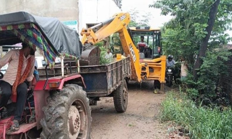 जेसीबी से हो रही अतिक्रमण वाले नाल आहार की उड़ाही