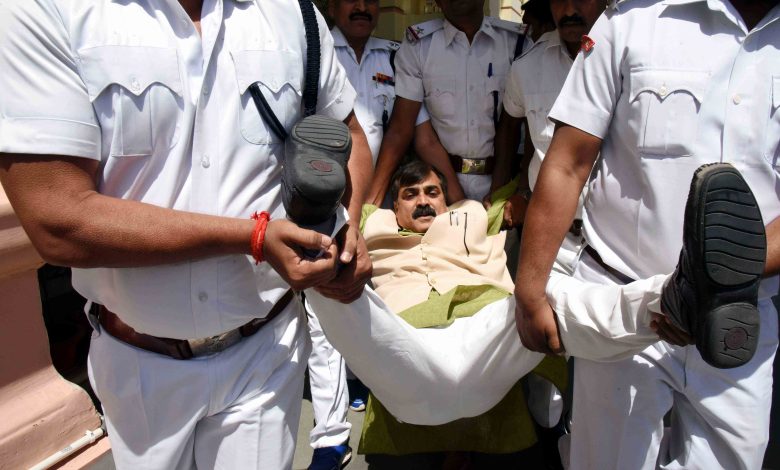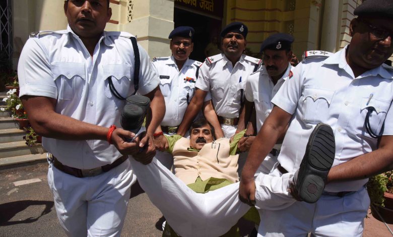 पटना। बिहार में हिंसा को लेकर विधानसभा में बजट सत्र के आखिरी दिन भाजपा विधायकों ने जमकर हंगामा किया। भाजपा विधायक जीवेश मिश्रा को 5 मार्शलों ने टांगकर सदन से बाहर निकाला। रामनवमी के दौरान हुई हिंसा को लेकर बुधवार को ये विधायक सदन में मुख्यमंत्री नीतीश कुमार से जवाब मांग रहे थे। स्पीकर ने उन्हें 2-3 बार बैठने को कहा। जब वे नहीं माने तो स्पीकर ने मार्शल बुलाकर एमएलए जीवेश मिश्रा को बाहर निकालने का आदेश दे दिया। इसके बाद सदन की कार्यवाही स्थगित कर दी गई। जब कार्यवाही फिर से शुरू हुई तो स्पीकर ने समापन भाषण देकर उसे अनिश्चितकाल तक के लिए स्थगित कर दिया। भाजपा विधायक मिश्रा ने कहा कि सदन में मुख्यमंत्री और उपमुख्यमंत्री दोनों नहीं थे। मैं तो उन्हें बुलाकर जवाब देने की मांग रहा था। सासाराम और बिहारशरीफ में रामनवमी जुलूस के दौरान हुई हिंसा को लेकर विपक्षी दल भाजपा नीतीश सरकार को घेरने की कोशिश कर रही है।