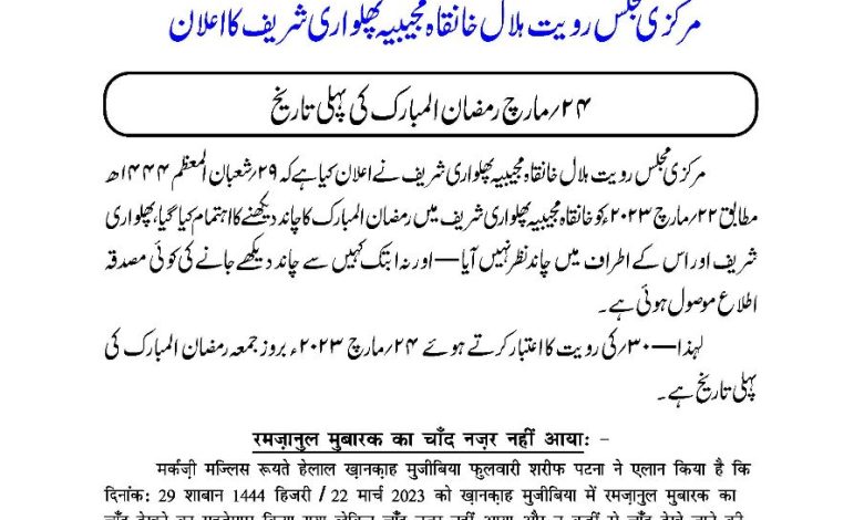 बिहार झारखंड उड़ीसा के मुसलमानों की सबसे बड़ी एदारा इमारत शरिया के काजी ए शरीयत मौलाना अंजार आलम कासमी एवं खानकाह ए मुजिबिया फुलवारी शरीफ के प्रशासक हजरत मौलाना मिनहाजुद्दीन कादरी ने घोषणा किया है कि गुरुवार को माहे रमजान का चांद नजर नहीं आया , इस कारण माहे रमजान की 1 तारीख शुक्रवार होगी और पहला रोजा शुक्रवार से शुरू होगा।